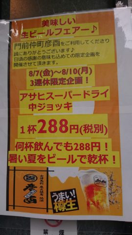 な、な、なんと、明日からの5日間限定で、生ビール288円(税別)での御提供!