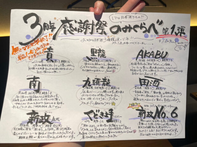 【葛西彦酉3周年感謝祭第3段‼️】 2025.09.08 みなさんこんにちわ! 葛西彦酉の優星です! 今週から日本酒飲み比べも始めるのでご紹介です! 左上から -貴- -黒龍- -AKABU- 山口県 福井県 岩手県 -南- -九頭龍- -田酒- 高知県 福井県 青森県 -新政-生成- -くどき上手-おまち- 新政No.6- 秋田県 山形県 秋田県 です! 1合での販売はしていないです! 全て飲み比べでの販売となります! ぜひご来店して飲んでみてください! あと3週間お祭りしましょ!! ※無くなり次第終了です!