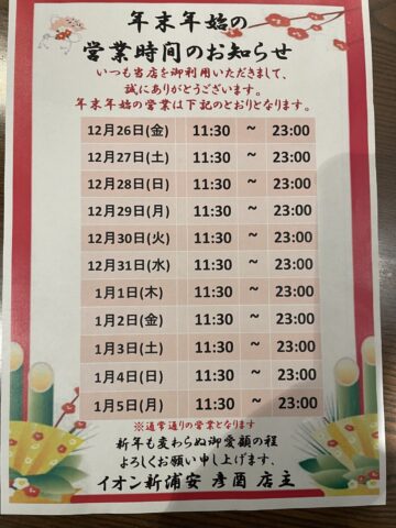年末年始の営業時間が決まりましたのでお知らせ致します!今年は大晦日・元旦共に通常営業、全日11時30分〜23時(フードLO22時、ドリンクLO22時30分)までの営業となりますので皆様宜しくお願い致します!