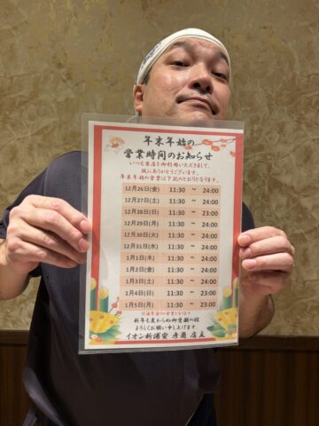 年末年始の営業時間延長!【新浦安彦酉】 2025.12.08 皆さんこんにちは! イオン新浦安彦酉のいっしーです! 前回、年末年始の営業時間について告知させて頂きましたが…皆様からのご要望にお応えして、我らが番長の力で12月26日、27日と12月29日〜1月3日は24時まで営業できる事になりました! 大晦日は皆でハッピーニューイヤー…しちゃいますか!? 御来店、お待ちしております!