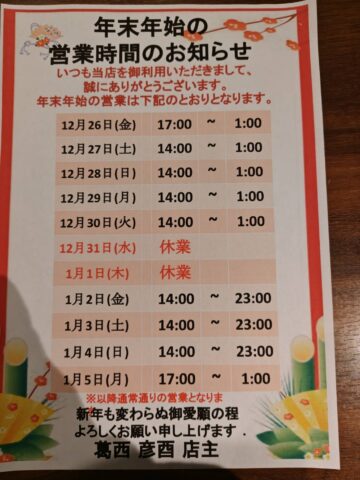 タイトルなし 2025.12.26 みなさんこんにちわ!😋 葛西彦酉の優星です! クリスマスも終わり、もうすぐ年明けですね! そして本日は年末年始の営業のご連絡です! 29日30日は平日ですが14時からオープンしております! 31日と1日はお休みで2日から営業再開です! 2日3日4日は14時から23時までといつもより閉店お早めです!🕰️ 2025年も残りわずかですが皆様よろしくお願いします!🎍 ご来店お待ちしております!