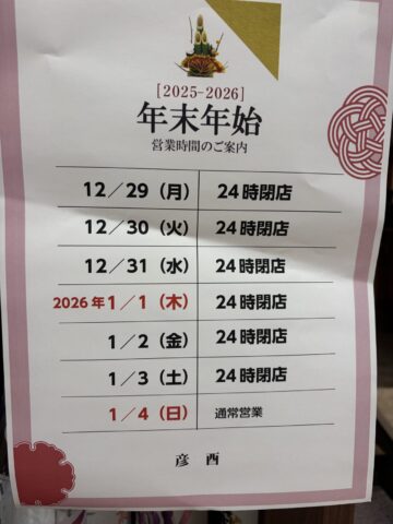 今年もいよいよ後2日!里帰りされる方、友人や恋人と一緒に過ごされる方、色々いらっしゃるのではないでしょうか?イオン新浦安彦酉は大晦日も元旦も、元気に営業しております!