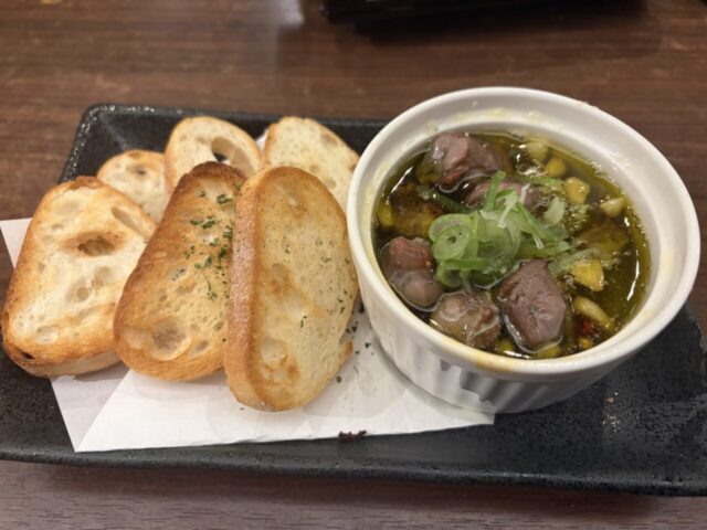 たっぷりの砂肝とネギ、それと少し辛めに味付けしたオリーブオイル…実は相性抜群なんです!添えてあるバケットと一緒にお楽しみ頂ければ!ワインなんかと召し上がって頂くのもオススメですね!